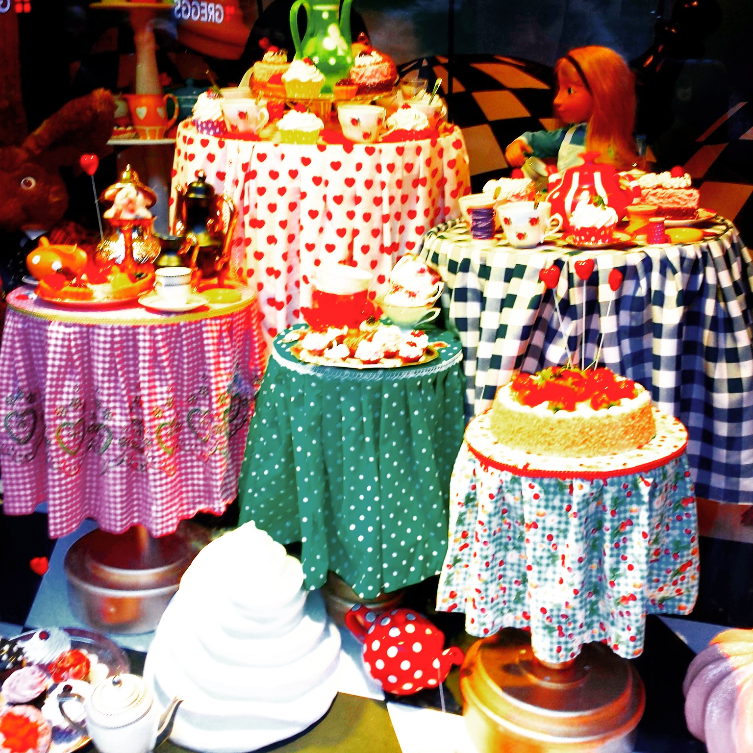 I also loved the windows at Fenwicks, which are kind of like the David Jones Christmas windows we have in Sydney, but they’d decked them out with scenes from Alice in Wonderland, which is one of my all time favourite stories. We visited Kate at her work (Fat Face), then spent the afternoon having tea and bangers and mash at this cute little cafe staffed by this really kooky guy who joined us as we compared the smells of our hand creams.
