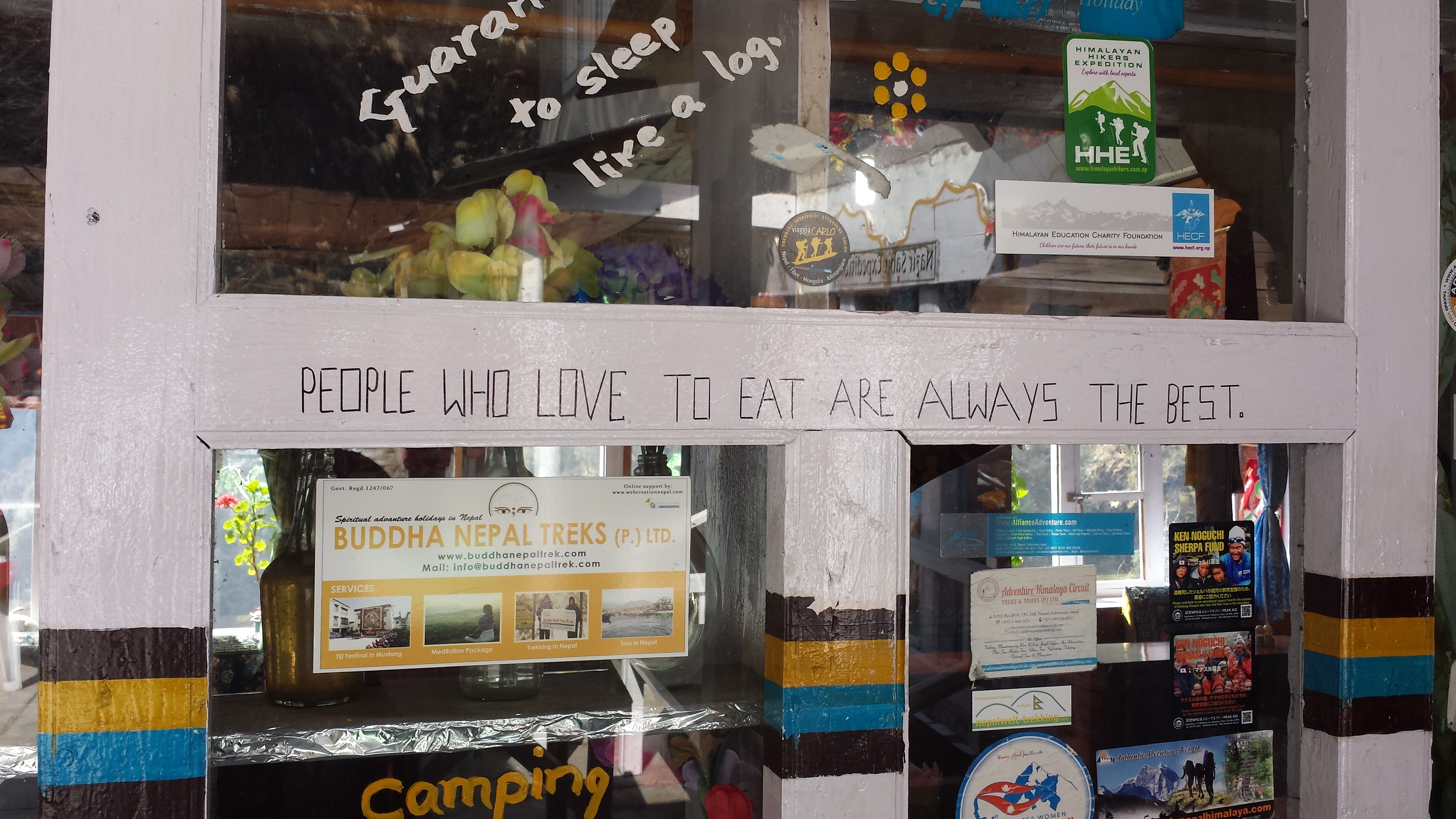 While they weren’t quite as romantic as the images my imagination had conjured up, that wasn’t too far from the reality of what the Nepalese tea houses were like. Well, in some ways. They’re bucolic structures made of stone and split logs, and any rugs you come across have been thinned down by the constant foot traffic that they have to endure. There aren’t stone fireplaces, but there are hardy back boilers that, when turned on (only on the coldest days, because it’s a bit of a luxury) emit the kind of warmth and comfort you’d associate with a tender embrace, and that we’d huddle around like a muster of penguins, just soaking it in.